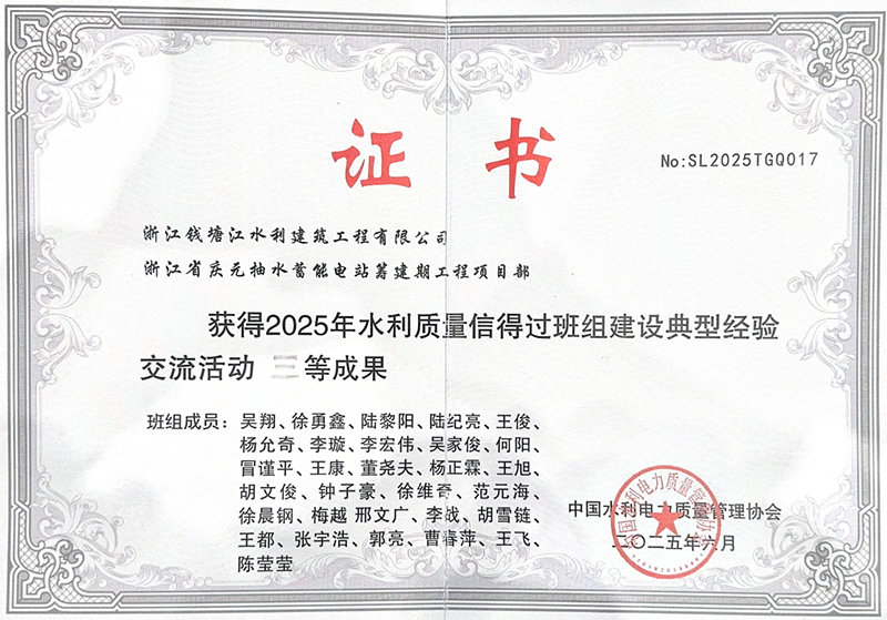 近日,中國水利電力質(zhì)量管理協(xié)會公布2025年度水利質(zhì)量信得過班組建設(shè)典型經(jīng)驗交流活動評選結(jié)果,慶元抽蓄籌建期EPC總承包項目憑借扎實有效的質(zhì)量管理實踐和突出的建設(shè)成果,榮獲“2025年水利質(zhì)量信得過班組建設(shè)典型經(jīng)驗交流活動”三等成果。這一榮譽不僅為“浙錢水建”品牌再添光彩,更標(biāo)志著公司在工程質(zhì)量管理領(lǐng)域獲得了行業(yè)權(quán)威機構(gòu)的高度認(rèn)可。