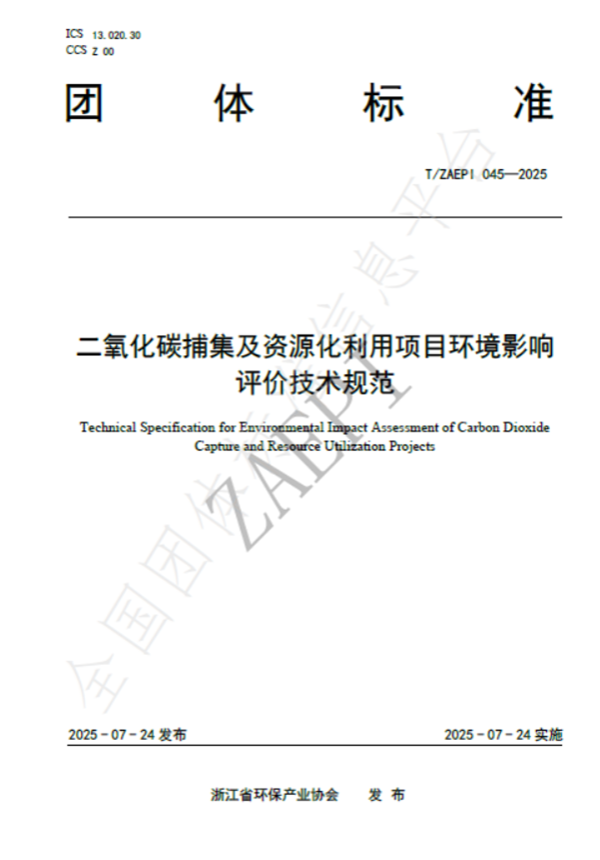 2025年7月24日,由浙江省環(huán)保集團(tuán)生態(tài)環(huán)保研究院牽頭制定的《二氧化碳捕集及資源化利用項目環(huán)境影響評價技術(shù)規(guī)范》(T/ZAEPI 045-2025)團(tuán)體標(biāo)準(zhǔn)正式發(fā)布并實施。該標(biāo)準(zhǔn)由浙江省環(huán)保產(chǎn)業(yè)協(xié)會歸口管理,聯(lián)合省內(nèi)多家環(huán)保領(lǐng)域骨干企業(yè)共同起草,填補了工業(yè)領(lǐng)域二氧化碳捕集及資源化利用項目環(huán)評技術(shù)規(guī)范的空白。